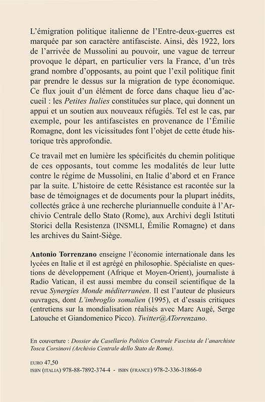 L'émigration italienne de l'Entre-deux-guerres est marquée par son caractère antifasciste. Ainsi, dès 1922, lors de l'arrivé e d e Mussolini au pouvoir, une vague de terreur provoque le départ d'un très grand nombre d'opposants. Cet ouvrage historique analyse notamment les flux de migrants de l'Émilie Romagne vers certaines régions de la France (le Sud et la banlieue parisienne).