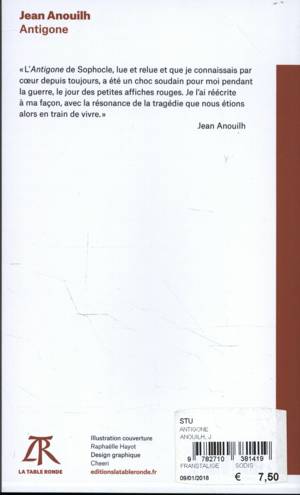 "L'Antigone de Sophocle, lue et relue et que je connaissais par coeur depuis toujours, a été un choc soudain pour moi pendant la guerre, le jour des petites affiches rouges. Je l'ai réécrite à ma façon, avec la résonance de la tragédie que nous étions alors en train de vivre." Jean Anouilh.