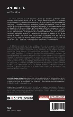Cet ouvrage se compose de neuf chapitres, autant que les lettres du nom homérique de la mère d’Ulysse, ANTIKLEIA. Chaque lettrine correspond à un ensemble de photographies d’Antikleia ainsi qu’à un texte poétique de style et de textures différentes : classique-linéaire, contemplative, visuelle, philosophique. En fait, chaque section propose de laisser apparaître l’articulation du photographiable et de la portée pénétrante du texte poétique qui l’accompagne. Le livre vise aussi à mettre en évidence les synergies et les tensions qui surgissent lorsque l’écriture poétique envahit le territoire de la photographie. Deux constantes forment le fil conducteur : la lumière en tant qu’origine, et Antikleia en tant qu’être féminin, échappant aux limites de la recherche photographique et de ses interfaces avec l’aventure poétique.