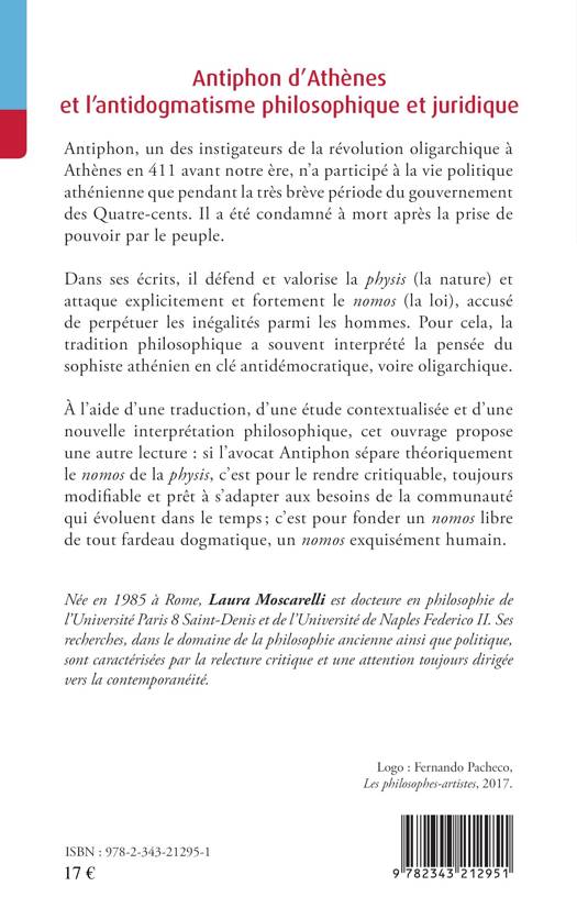 Antiphon, un des instigateurs de la révolution oligarchique à Athènes en -411, n'a participé à la vie politique que durant le bref gouvernement des Quatre-cents. Il a été condamné à mort après la prise de pouvoir par le peuple. Dans ses écrits, il défend et valorise la physis (la nature) et attaque le nomos (la loi), accusé de perpétuer les inégalités parmi les hommes. Pour cela, la tradition philosophique a souvent interprété la pensée du sophiste athénien comme étant antidémocratique. Cet ouvrage propose une autre lecture : si l'avocat Antiphon sépare théoriquement le nomos de la physis, c'est pour le rendre critiquable, toujours modifiable et prêt à s'adapter aux besoins de la communauté ; c'est pour fonder un nomos libre de tout fardeau dogmatique, un nomos exquisément humain.