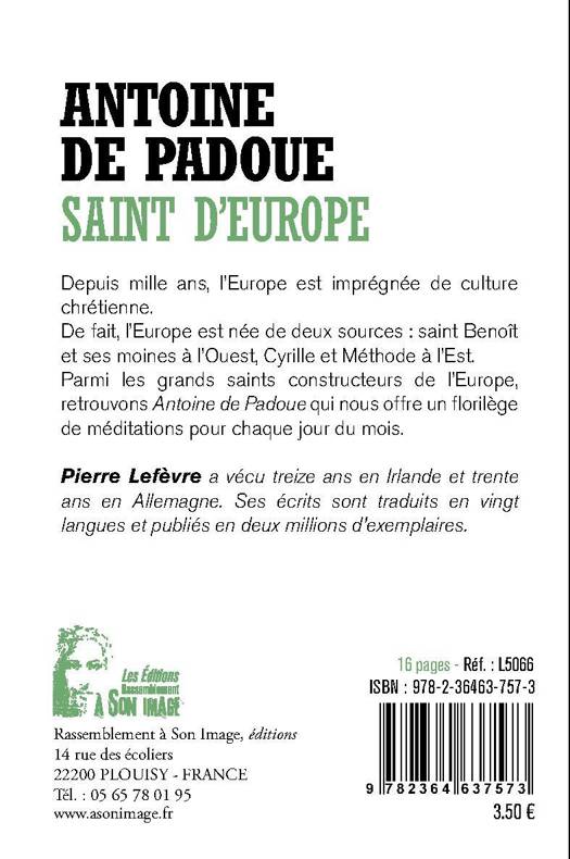 Antoine de Padoue Saint d'Europe Depuis mille ans, l'Europe est imprégnée de culture chrétienne. De fait, l'Europe est née de deux sources : saint Benoît et ses moines à l'Ouest, Cyrille et Méthode à l'Est. Parmi les grands saints constructeurs de l'Europe, retrouvons Antoine de Padoue qui nous offre un florilège de méditations pour chaque jour du mois.