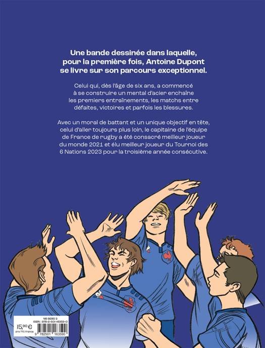 Une bande dessinée autobiographique dans laquelle, pour la première fois, Antoine Dupont se livre sur son parcours exceptionnel. Celui qui, dès l’âge de six ans, a commencé à se construire un mental d’acier, enchaîne les premiers entraînements, les matchs entre défaites et victoires, les blessures. Avec un moral de battant et un unique objectif en tête, celui d’aller toujours plus loin, le capitaine de l’équipe de France de rugby a été consacré meilleur joueur du monde 2021 et élu meilleur joueur du Tournoi des 6 Nations 2023 pour la troisième année consécutive.