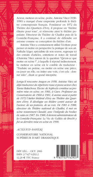 Acteur, metteur en scène, poète, Antoine Vitez (1930-1990) a marqué d'une empreinte profonde le théâtre contemporain français, notamment avec les années passées à la direction du Théâtre des Quartiers d'Ivry, où il invente un "théâtre élitaire pour tous", puis du Théâtre national de Chaillot. Qu'est-ce que mettre en scène ? Ce grand pédagogue nous répond à travers un choix parmi ses écrits et ses entretiens par Nathalie Léger (Institut Mémoires de l'édition contemporaine).