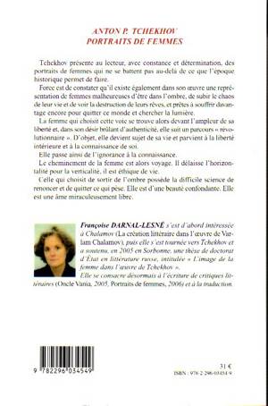 Tchekhov présente au lecteur, avec constance et détermination, des portraits de femmes qui ne se battent pas au-delà de ce que l'époque historique permet de faire. Force est de constater qu'il existe également dans son oeuvre une représentation de femmes malheureuses d'être dans l'ombre, de subir le chaos de leur vie et de voir la destruction de leurs rêves, et prêtes à souffrir davantage encore pour quitter ce monde et chercher la lumière. La femme qui choisit cette voie se trouve alors devant l'ampleur de sa liberté et, dans son désir brûlant d'authenticité, elle suit un parcours "révolutionnaire".