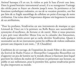 Animal baroque s'il en est, le violon se paie le luxe d'avoir une âme. Dans le grand bestiaire instrumental actuel, il a su transgresser l'usinage des siècles pour se frayer un chemin jusqu'à nous. Sa persistance et les fonctions symboliques endossées, en sus de sa vocation première, ont fini par faire de ce fragile assemblage de cellulose un point d'ancrage de notre civilisation. Une icône dont l'importance dépasse très largement la somme de ses attributions. "Pour les profanes, Stradivarius est aux instruments de musique ce que Léonard de Vinci est à la peinture ou Rolls Royce aux automobiles : synonyme d'excellence, de fortune et de rareté. Mais si nous pouvons à peu près tous identifier Mona Lisa ou la calandre des limousines, seuls quelques initiés savent qui se cache derrière Stradivarius. Quant à reconnaître un de ses instruments parmi les millions de violons ordinaires portant une étiquette à son nom..." (F. Chaudière) L'ambition de cet ouvrage, de l'exposition du musée Fabre et des concerts du festival de Radio France et Montpellier Languedoc-Roussillon est d'apporter un peu de lumière sur le monde obscur et fascinant dans lequel gravitent les violons du maître de Crémone en présentant aux lecteurs, au public et aux mélomanes, pour la première fois, quinze stradivarius parmi les plus importants au monde.