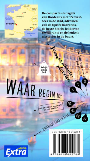 ANWB Extra reisgids Bordeaux Beleef Bordeaux met de nieuwe reisgids ANWB Extra Bordeaux! Deze Franse stad is een metropool vol prachtige architectuur en kunstschatten, gelegen aan de rivier en deels autovrij. Met toprestaurants, leuke kroegen en met alle winkels die je maar kunt wensen, vind je altijd wel iets van je gading. De ANWB Extra reisgids Bordeaux biedt naast veel praktische tips over accommodatie, restaurants en vervoer ook 15 inspirerende bezienswaardigheden die je niet mag missen. Shop je portemonnee leeg in de winkels van de chique Triangle d’Or, struin door de groene Jardin Public of bezoek het nabijgelegen St-E?milion voor de lekkerste wijn.