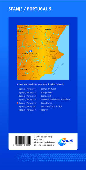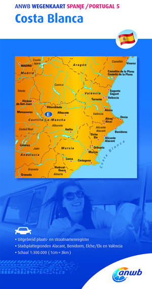 ANWB Wegenkaart Costa Blanca Met de gedetailleerde en nauwkeurige ANWB Wegenkaart Spanje/Portugal 5: Costa Blanca op schaal 1:300.000 (1 cm = 3 km), ga je goed voorbereid op autovakantie. De kaart bevat een uitgebreid plaats- en straatnamenregister en stadsplattegronden van Alacant, Benidorm, Elx/Elche en València/Valencia. In de legenda vind je uitgebreide toeristische informatie.