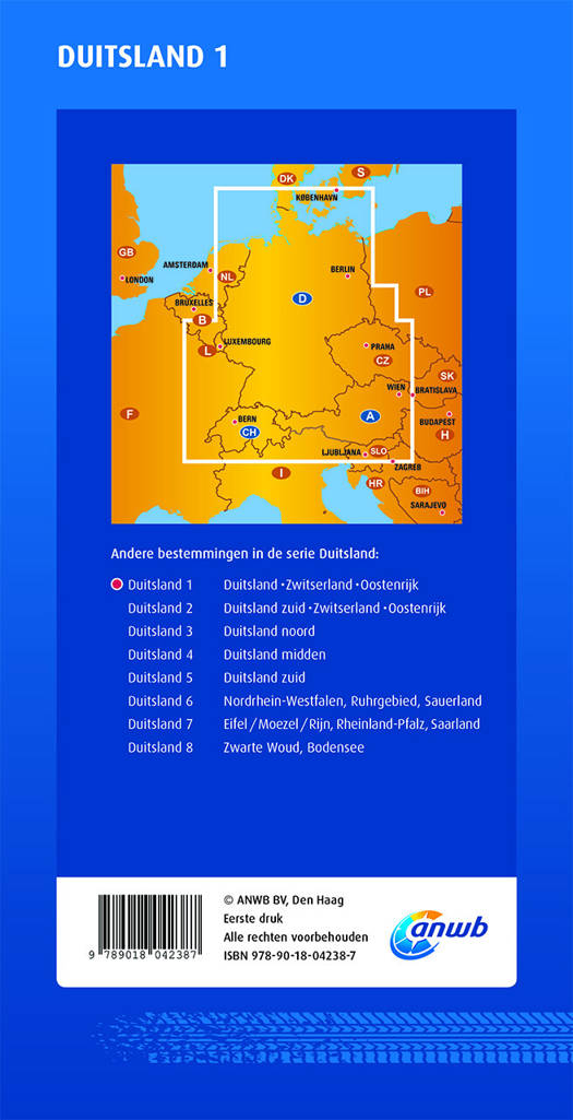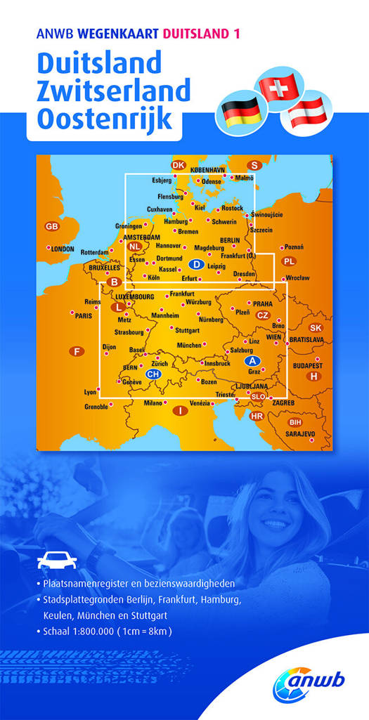 ANWB Wegenkaart Duitsland * Zwitserland * Oostenrijk Met de gedetailleerde en nauwkeurige ANWB Wegenkaart Duitsland * Zwitserland * Oostenrijk op schaal 1:800.000 (1 cm = 8 km), ga je goed voorbereid op autovakantie. De kaart bevat een uitgebreid plaatsnamenregister en stadsplattegronden van Berlijn, Frankfurt, Hamburg, Keulen, München en Stuttgart. In de legenda vind je uitgebreide toeristische informatie.
