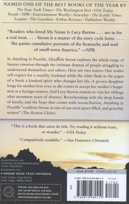 In Anything Is Possible, Elizabeth Strout explores the whole range of human emotion through the intimate dramas of people struggling to understand themselves and others. Here are two sisters: One trades self-respect for a wealthy husband while the other finds in the pages of a book a kindred spirit who changes her life. A grown daughter longs for mother love even as she comes to accept her mother's happiness in a foreign country. And Lucy Barton returns to visit her siblings after seventeen years of absence.