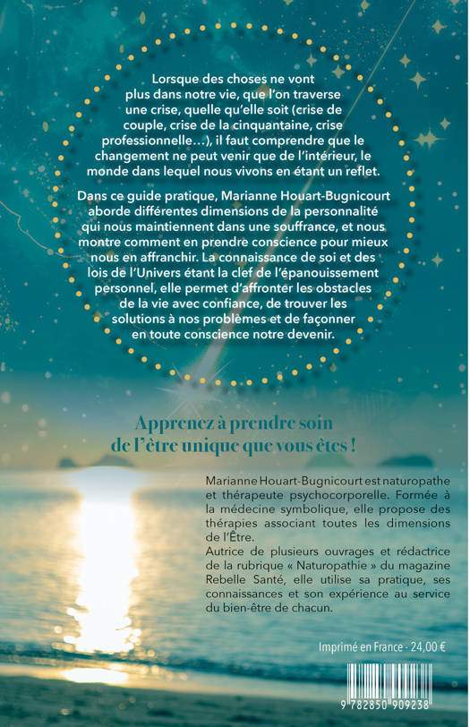 Lorsque des choses ne vont plus dans notre vie, que l’on traverse une crise, quelle qu’elle soit (crise de couple, crise de la cinquantaine, crise professionnelle...), il faut comprendre que le changement ne peut venir que de l’intérieur, le monde dans lequel nous vivons en étant un reflet. Dans ce guide pratique, Marianne Houart-Bugnicourt aborde différentes dimensions de la personnalité qui nous maintiennent dans une souffrance, et nous montre comment en prendre conscience pour mieux nous en affranchir. La connaissance de soi et des lois de l’Univers étant la clef de l’épanouissement personnel, elle permet d’affronter les obstacles de la vie avec confiance, de trouver les solutions à nos problèmes et de façonner en toute conscience notre devenir.