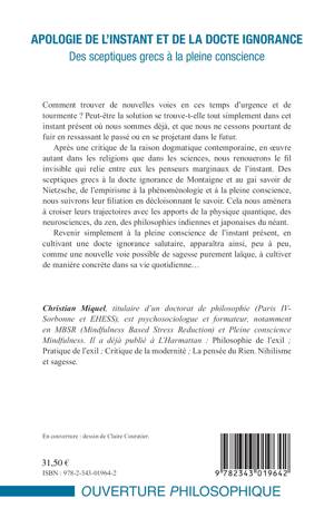 Après une critique de la raison dogmatique contemporaine, nous renouerons le fil invisible qui relie entre eux les penseurs marginaux de l'instant. Des sceptiques grecs à la docte ignorance de Montaigne et au gai savoir de Nietzsche, de l'empirisme à la phénoménologie et à la pleine conscience, nous suivrons leur filiation en décloisonnant le savoir. Cela nous amènera à croiser leurs trajectoires avec les apports de la physique quantique, des neurosciences, du zen, des philosophies indiennes et japonaises du néant.
