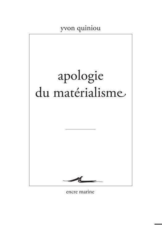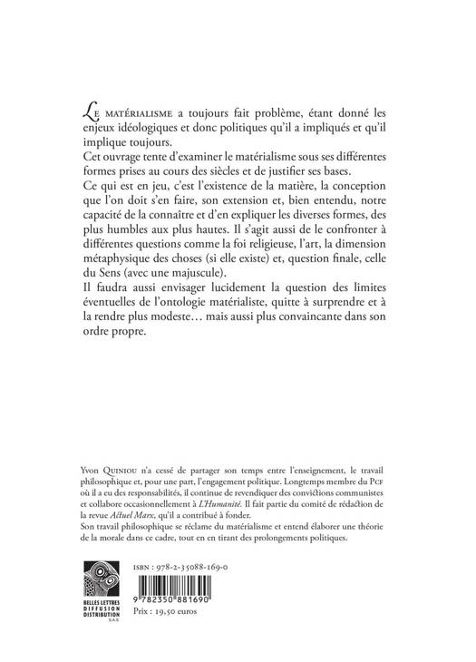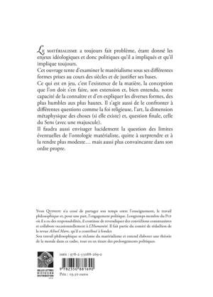 Le materialisme a toujours fait probleme, etant donne les enjeux ideologiques et donc politiques qu'il a impliques et qu'il implique toujours. Cet ouvrage tente d'examiner le materialisme sous ses differentes formes prises au cours des siecles et de justifier ses bases. Ce qui est en jeu, c'est l'existence de la matiere, la conception que l'on doit s'en faire, son extension et, bien entendu, notre capacite de la connaitre et d'en expliquer les diverses formes, des plus humbles aux plus hautes. Il s'agit aussi de le confronter a differentes questions comme la foi religieuse, l'art, la dimension metaphysique des choses (si elle existe) et, question finale, celle du Sens (avec une majuscule). Il faudra aussi envisager lucidement la question des limites eventuelles de l'ontologie materialiste, quitte a surprendre et a la rendre plus modeste... mais aussi plus convaincante dans son ordre propre.