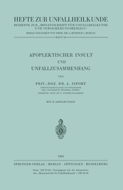Der Tod durch Gehirnblutung und sonstige Gefäßstörungen des Zentralnervensystems stand im Jahre 1958 in der Statistik der Sterbe- fälle auf dem 3. Platz, - nach den Herzkrankheiten und den bösartigen Neubildungen. Gegenüber 1938 sind die Zahlen nahezu verdoppelt. In meinen Monographien habe ich wiederholt darauf hingewiesen, daß die organischen vasculären Erkrankungen ganz allgemein und besonders auch des Hirnkreislaufs unzweifelhaft ständig zunehmen. Hinsichtlich der Hirngefäße haben inzwischen die objektiven Zahlen meine Prognose erschreckend eindeutig bestätigt. Eine Verminderung des apoplektischen Insultes als Todesursache stellt für die gesamte Ärzteschaft ein dank- bares, allerdings nicht ganz leichtes Betätigungsfeld dar. Die optimale Therapie mit Aufstellung eines wohlbegründeten Behandlungsplanes muß aber von unumgänglichen differentialdiagnostischen Erwägungen aus- gehen. In der vorliegenden Schrift nimmt die cerebrale Angiographie bei der Diagnostik der verschiedenen Ursachen des apoplektischen In- sultes mit Recht einen breiten Raum ein. Die Hirngefäßkontrast- darstellung ist bei sachgerechter Durchführung zu einer praktisch ge- fahrlosen Untersuchungsmethode geworden und für die Beurteilung der tumorösen Prozesse sowie der organischen, funktionellen und traumati- schen Durchblutungsstörungen nicht mehr wegzudenken. Auf die operativen Behandlungsmöglichkeiten wird vom Verfasser an Hand des umfangreichen Krankengutes der Klinik eingegangen. Herr ISFoRT befaßt sich aber auch noch ganz besonders mit dem praktisch wichtigen Fragenkomplex der Unfallzusammenhangsbeurtei- lung, soweit er angiographisch irgendwie näher zu klären ist. Dieser Fragenkomplex des apoplektischen Insultes stellt den unfallmedizini- schen Gutachter vielfach vor recht schwierige Entscheidungen, zumal die laienmäßige Auffassung gerade auch hier in jedem Fall gern einen Unfall erblickt.