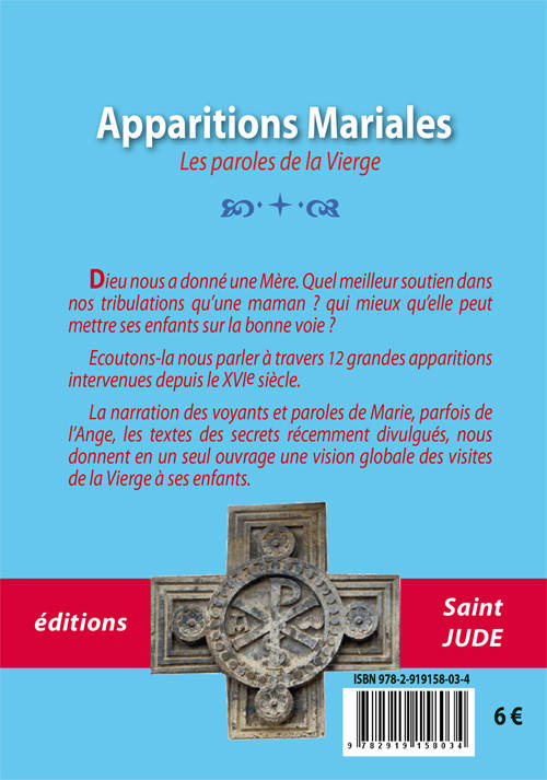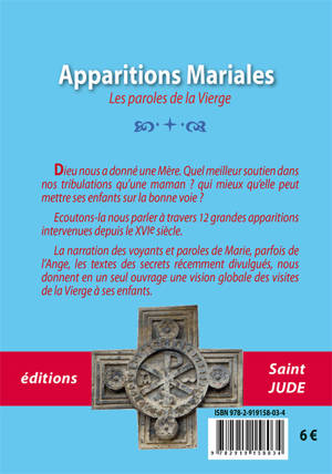 Les Apparitions de la Vierge à ses enfants, Messages de 12 grandes apparitions reconnues par l'Église depuis le XVIe siècle : - GARAISON - GUADALUPE - L'OSIER - Le LAUS - PARIS Rue du Bac - ROME, Alphonse Ratisbonne - La SALETTE - LOURDES - PONTMAIN - PELLEVOISIN - GIETRZWALD - FATIMA Pour chaque Lieu, l'ouvrage présente le lieu et le contexte des apparitions, la narration des voyants, les paroles de la Vierge et les textes des secrets récemment divulgués.