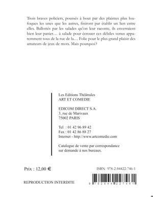 Trois braves policiers, poussés à bout par des plaintes plus loufoques les unes que les autres, finiront par établir un lien entre elles. Ballottés par les salades qu'on leur raconte, ils enverraient bien leur panier... à salade pour écrouer ces débiles venus apparemment tous de la rue de la... Folie pour le plus grand plaisir des amateurs de jeux de mots. Mais pourquoi ?