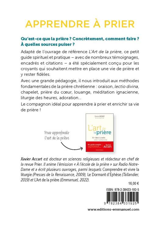 Ce livre très pédagogique contient les plus belles et les plus célèbres méthodes de prière de la tradition chrétienne, extraites du livre L’Art de la prière : oraison, lectio divina, chapelet, prière du coeur, louange, méditation ignacienne, liturgie des heures, adoration… Un guide pratique, illustré de témoignages, encadrés et citations, spécialement conçu pour les croyants qui souhaitent mettre en place une vie de prière et y rester fidèle. Le compagnon idéal pour apprendre à prier et enrichir sa vie de prière !