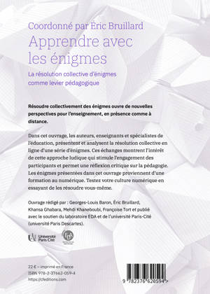 Dans cet ouvrage, les auteurs, enseignants et spécialistes de l'éducation, présentent et analysent la résolution collective en ligne d'une série d'énigmes. Ces échanges montrent l'intérêt de cette approche ludique qui stimule l'engagement des participants et permet une réflexion critique sur la pédagogie. Les énigmes présentées dans cet ouvrage proviennent d'une formation en ligne au numérique. On peut donc essayer de les résoudre pour tester sa propre culture numérique.