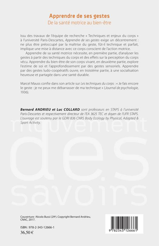 Apprendre de sa santé motrice nécessite, en première partie, d'analyser les gestes à partir des techniques du corps et des effets sur la perception du corps vécu. Apprendre du bien-être de son corps vivant, en deuxième partie, explore l'estime de soi et l'approfondissement par des gestes sensoriels. Apprendre par des gestes ludo-coopératifs ouvre, en troisième partie, à une socialisation heureuse et partagée dans une santé durable.