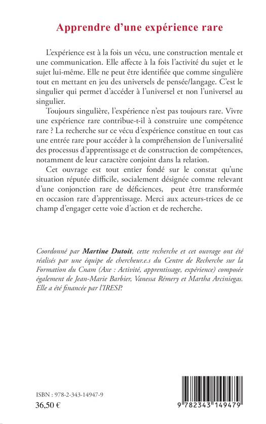 Toujours singulière, l'expérience n'est pas toujours rare. Vivre une expérience rare contribue-t-il à construire une compétence rare ? La recherche sur ce vécu d'expérience constitue en tout cas une entrée rare pour accéder à la compréhension de l'universalité des processus d'apprentissage et de construction de compétences, notamment de leur caractère conjoint dans la relation. Cet ouvrage est tout entier fondé sur le constat qu'une situation réputée difficile, socialement désignée comme relevant d'une conjonction rare de déficiences, peut être transformée en occasion rare d'apprentissage.
