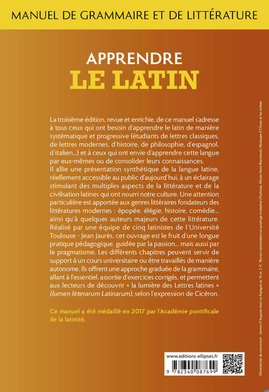La troisième édition, revue et enrichie, de ce manuel s’adresse à tous ceux qui ont besoin d’apprendre le latin de manière systématique et progressive (étudiants de lettres classiques, de lettres modernes, d’histoire, de philosophie, d’espagnol, d’italien…) et à ceux qui ont envie d’apprendre cette langue par eux-mêmes ou de consolider leurs connaissances.