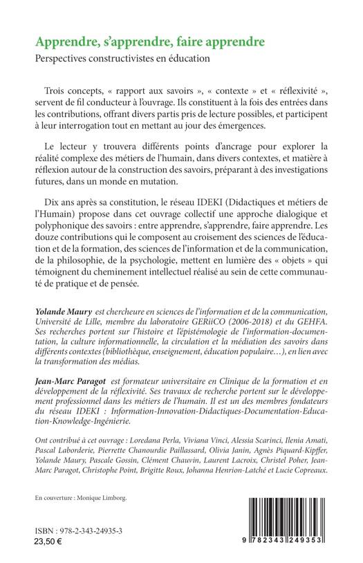 Trois concepts,« rapport aux savoirs », « contexte » et « réflexivité », servent de fil conducteur à l’ouvrage. Ils constituent à la fois des entrées dans les contributions, offrant divers partis pris de lecture possibles, et participent à leur interrogation tout en mettant au jour des émergences. Le lecteur y trouvera différents points d’ancrage pour explorer la réalité complexe des métiers de l’humain, dans un monde en mutation. Dix ans après sa constitution, le réseau IDEKI (Didactiques et métiers de l’Humain) propose dans cet ouvrage une approche dialogique des savoirs : entre apprendre, s’apprendre, faire apprendre.