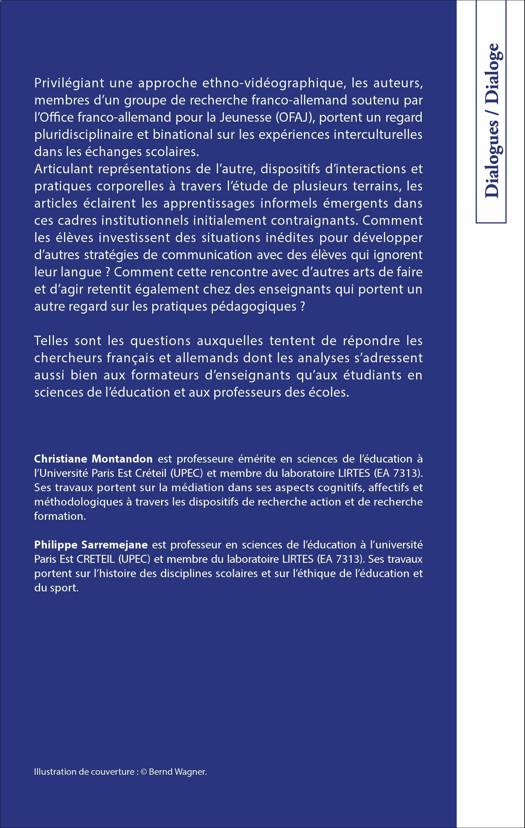 Comment les élèves investissent des situations inédites pour développer des stratégies de communication avec des élèves qui ignorent leur langue ? Comment cette rencontre avec d'autres arts de faire et d'agir retentit chez les enseignants qui portent un autre regard sur les pratiques pédagogiques ? Privilégiant une approche pluridisciplinaire et binationale, les auteurs, membres d'un groupe de recherche franco-allemand, partagent les expériences interculturelles qui sont les leurs. Articulant représentations de l'autre, dispositifs d'interactions et pratiques corporelles, les articles ici rassemblés s'adressent aussi bien aux formateurs d'enseignants qu'aux étudiants.