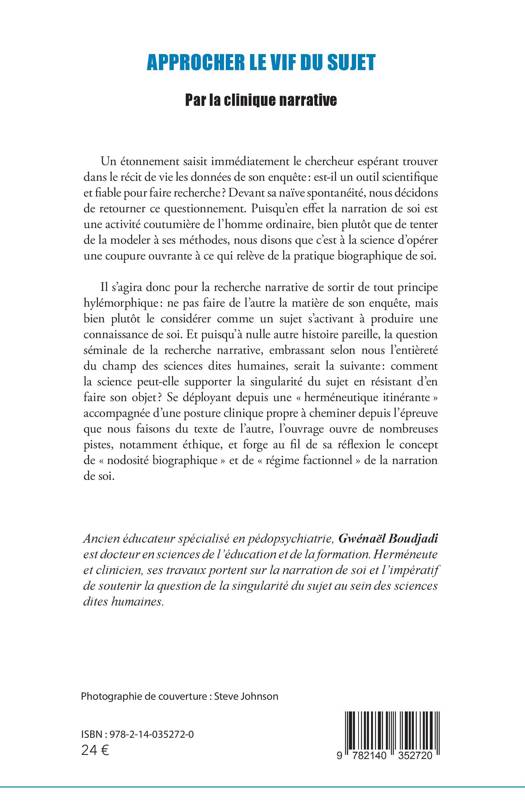 Un étonnement saisit immédiatement le chercheur espérant trouver dans le récit de vie les données de son enquête: est-il un outil scientifique et fiable pour faire recherche ? Devant sa naïve spontanéité, nous décidons de retourner ce questionnement. Puisqu'en effet la narration de soi est une activité coutumière de l'homme ordinaire, bien plutôt que de tenter de la modeler à ses méthodes, nous disons que c'est à la science d'opérer une coupure ouvrante à ce qui relève de la pratique biographique de soi. Il s'agira donc pour la recherche narrative de sortir de tout principe hylémorphique: ne pas faire de l'autre la matière de son enquête, mais bien plutôt le considérer comme un sujet s'activant à produire une connaissance de soi. Et puisqu'à nulle autre histoire pareille, la question séminale de la recherche narrative, embrassant selon nous l'entièreté du champ des sciences dites humaines, serait la suivante: comment la science peut-elle supporter la singularité du sujet en résistant d'en faire son objet ? Se déployant depuis une herméneutique itinérante accompagnée d'une posture clinique propre à cheminer depuis l'épreuve que nous faisons du texte de l'autre, l'ouvrage ouvre de nombreuses pistes, notamment éthique, et forge au fil de sa réflexion le concept de nodosité biographique et de régime factionnel de la narration de soi.