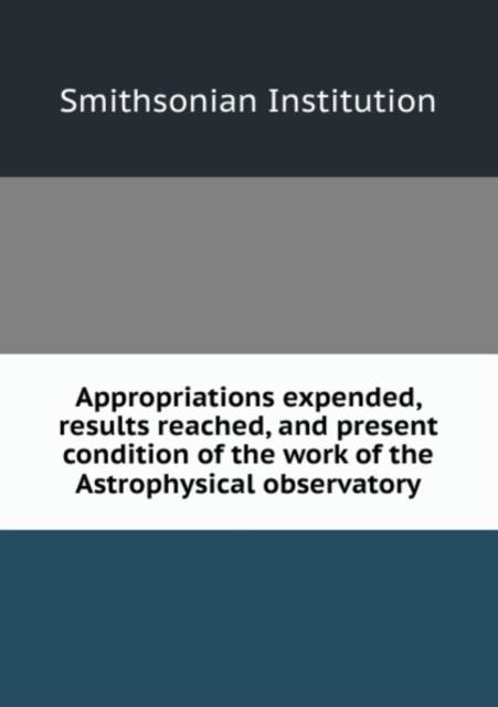 Appropriations expended, results reached, and present condition of the work of the Astrophysical observatory This book, "Appropriations expended, results reached, and present condition of the work of the Astrophysical observatory", by Smithsonian Institution, is a replication of a book originally published before 1902. It has been restored by human beings, page by page, so that you may enjoy it in a form as close to the original as possible. This book was created using print-on-demand technology. Thank you for supporting classic literature.
