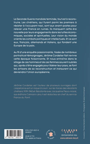 Les chrétiens, qui furent parmi les premiers à résister à l’occupant nazi, sont aux avant-postes pour relever une France en ruines. Ils marquent cette ère nouvelle par leurs engagements dans les luttes économiques, sociales et spirituelles. Leur vision du monde oriente les combats politiques et intellectuels. Et ce sont eux, français, allemands et italiens, qui fondent une Europe de la paix.