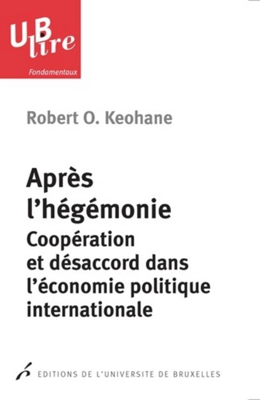 R. O. Keohane étudie l'évolution de la coopération internationale sur les grands défis mondiaux et s'interroge sur la systématique émergence d'une puissance hégémonique dans un contexte de coopération multilatérale, comme ce fut le cas avec les Etats-Unis au sortir de la Seconde Guerre mondiale. Il analyse les institutions qui ont permis la coopération dans l'économie politique internationale.