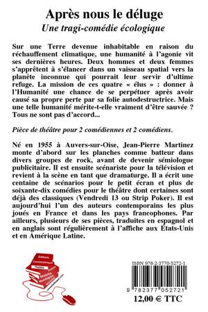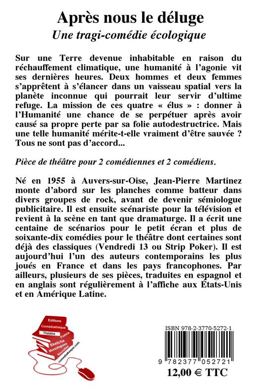 Sur une Terre devenue inhabitable en raison du réchauffement climatique, une humanité à l’agonie vit ses dernières heures. Deux hommes et deux femmes s’apprêtent à s’élancer dans un vaisseau spatial vers la planète inconnue qui pourrait leur servir d’ultime refuge. La mission de ces quatre « élus » : donner à l’Humanité une chance de se perpétuer après avoir causé sa propre perte par sa folie autodestructrice. Mais une telle humanité mérite-t-elle vraiment d’être sauvée ? Tous ne sont pas d’accord... Une tragi-comédie écologique pour deux comédiennes et deux comédiens.