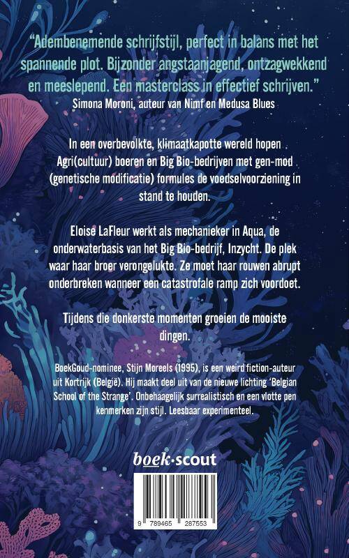 "Adembenemende schrijfstijl, perfect in balans met het spannende plot. Bijzonder angstaanjagend, ontzagwekkend en meeslepend. Een masterclass in effectief schrijven." — Simona Moroni, auteur van Nimf en Medusa Blues. In een overbevolkte, klimaatkapotte wereld hopen Agri(cultuur)boeren en Big Bio-bedrijven met gen-mod (genetische modificatie) formules de voedselvoorziening in stand te houden. Eloise LaFleur werkt als mekanieker in Aqua, de onderwaterbasis van het Big Bio-bedrijf Inzycht. Op de plek waar haar broer verongelukte. Ze moet haar rouwen abrupt onderbreken wanneer een catastrofale ramp zich voordoet. Tijdens die donkerste momenten groeien de mooiste dingen.