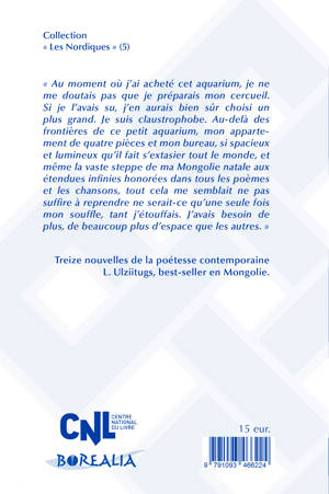 13 nouvelles, 13 portraits de femmes intimistes pour un nouveau visage de la femme, par la best-seller mongole Ulziitugs. «Au moment où j’ai acheté cet aquarium, je ne me doutais pas que je préparais mon cercueil. Si je l’avais su, j’en aurais bien sûr choisi un plus grand. Je suis claustrophobe. Au-delà des frontières de ce petit aquarium, mon appartement de quatre pièces et mon bureau, si spacieux et lumineux qu’il fait s’extasier tout le monde, et même la vaste steppe de ma Mongolie natale aux étendues infinies honorées dans tous les poèmes et les chansons, tout cela me semblait ne pas suffire à reprendre ne serait-ce qu’une seule fois mon souffle, tant j’étouffais. J’avais besoin de plus, de beaucoup plus d’espace que les autres. ». Un livre soutenu par le CNL. Un livre d’une grande force. L. Ulziitugs nous présente la Mongolie d’aujourd’hui dans une économie de mots poussée à l’extrême. On dépasse ici rarement la vingtaine de pages lors de micro-récits qui n’épargnent rien à leurs personnages. L’auteur mélange les styles d’écritures et la forme de ses récits pour aboutir à un cocktail maîtrisé, homogène et puissant qui nous prend aux tripes et nous interroge sur notre rapport à l’autre et où l’on vie. L. Ulziitugs nous offre un recueil a l’atmosphère si particulière, originale et qui nous fait voyager. univers très frais, très féminin, intrigant et envoutant, parfois cruel, à la frontière entre rêve et souvenir. Un univers qui peut faire penser à Ogawa par son onirisme, son côté très poétique mais aussi très dur. L’auteur a une plume magnifique, très poétique, très profonde et magnifiquement musicale. Un livre tout en poésie