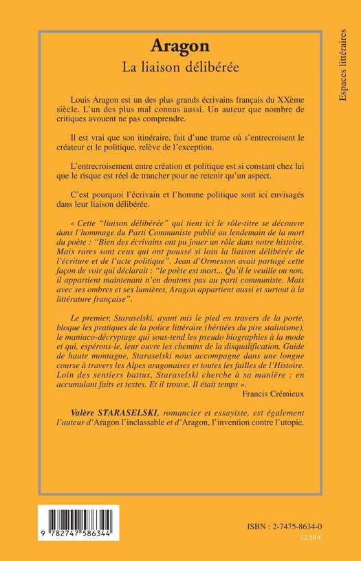 Ce livre est "indispensable pour qui veut dévisager le véritable Aragon. Valère Staraselski a en effet choisi d'étudier l'homme dans sa totalité, à la fois dans ses multiples visages et dans son unité. [...] Il traque cette liaison délibérée entre l'écriture et l'acte politique dans les faits, dans les écrits, dans les relations, dans les actes de Louis Aragon, et balaie au passage les contrevérités et les médiocres commentaires des censeurs de tous bords." Rémi BoyerŠ