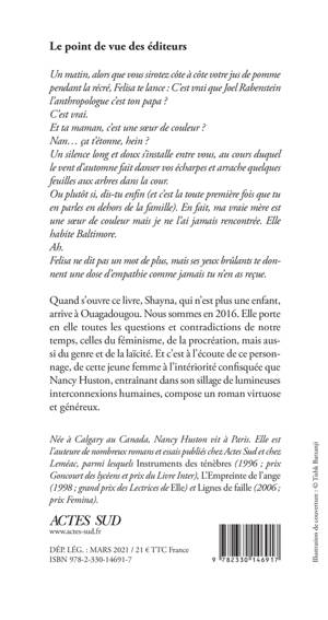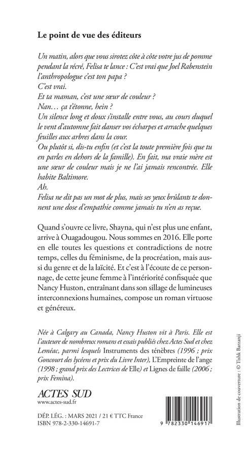 Quand s'ouvre ce livre, Shayna, qui n'est plus une enfant, arrive à Ouagadougou. Nous sommes en 2016. Elle porte en elle toutes les questions et contradictions de notre temps, celles du féminisme, de la procréation, mais aussi du genre et de la laïcité. Et c'est à l'écoute de ce personnage, de cette jeune femme à l'intériorité confisquée que Nancy Huston, entraînant dans son sillage de lumineuses interconnexions humaines, compose un roman virtuose et généreux.