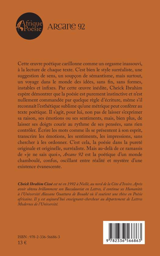 Cette oeuvre poétique carillonne comme un orgasme inassouvi, à la lecture de chaque texte. C'est bien le style surréaliste, une suggestion de sens, un soupçon de sémantisme, mais surtout, un voyage dans le monde des idées, sans fin, sans formes, instables et infixes. Par cette oeuvre inédite, Cheick Ibrahim espère démontrer que la poésie est purement instinctive et n'est nullement commandée par quelque règle d'écriture, même s'il reconnaît l'esthétique sublime qu'une métrique peut conférer au texte poétique. Il s'agit, pour lui, non pas de laisser s'exprimer sa raison, ses émotions ou ses sentiments, mais, bien plus, de laisser ses doigts courir au rythme de ses pensées, sans rien contrôler. Écrire les mots comme ils se présentent à son esprit, transcrire les émotions, les sentiments, les impressions, sans chercher à les ordonner. C'est cela, la poésie dans la pureté originale et originelle, surréaliste. Mais au-delà de ce ramassis de je ne sais quoi, Arcane 92 est la poétique d'un monde chamboulé, confus, oscillant entre réalité et mystère d'une existence évanescente.