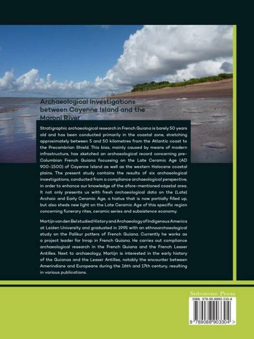 "Stratigraphic archaeological research in French Guiana is barely 50 years old and has been conducted primarily in the coastal zone, stretching approximately between 5 and 50 kilometres from the Atlantic coast to the Precambrian Shield. This bias, mainly caused by means of modern infrastructure, has sketched an archaeological record concerning pre-Columbian French Guiana focussing on the Late Ceramic Age (AD 900-1500) of Cayenne Island as well as the western Holocene coastal plains. The present study contains the results of six archaeological investigations, conducted from a compliance archaeological perspective, in order to enhance our knowledge of the afore-mentioned coastal area. It not only presents us with fresh archaeological data on the (Late) Archaic and Early Ceramic Age, a hiatus that is now partially filled up, but also sheds new light on the Late Ceramic Age of this specific region concerning funerary rites, ceramic series and subsistence economy. Martijn van den Bel studied History and Archaeology of Indigenous America at Leiden University and graduated in 1995 with an ethnoarchaeological study on the Palikur potters of French Guiana. Currently he works as a project leader for Inrap in French Guiana. He carries out compliance archaeological research in the French Guiana and the French Lesser Antilles. Next to archaeology, Martijn is interested in the early history of the Guianas and the Lesser Antilles, notably the encounter between Amerindians and Europeans during the 16th and 17th century, resulting in various publications."