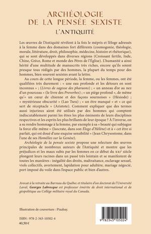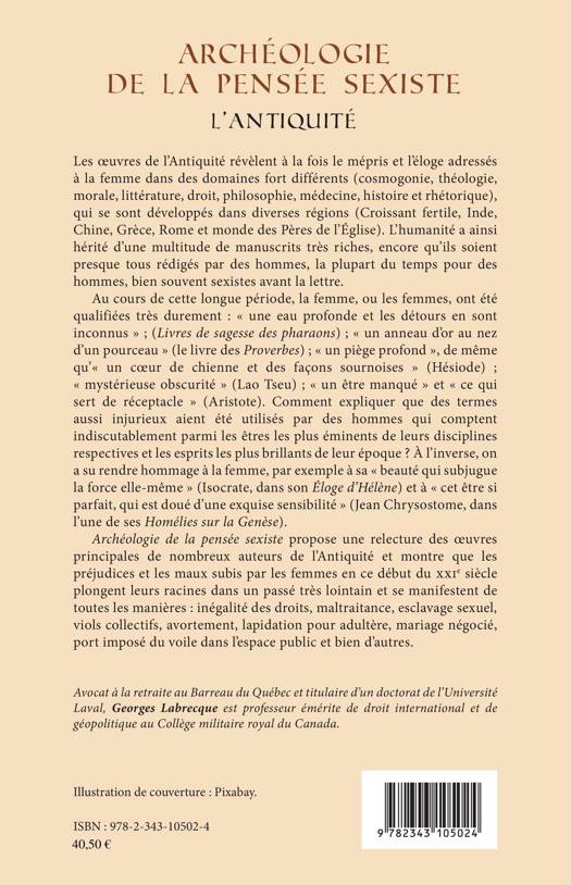 Les oeuvres de l'Antiquité révèlent à la fois le mépris et l'éloge adressés à la femme dans des domaines fort différents (théologie, morale, littérature, droit, philosophie etc.), qui se sont développés dans diverses régions du monde. L'humanité a ainsi hérité d'une multitude de manuscrits très riches, encore qu'ils soient presque tous rédigés par des hommes bien souvent sexistes avant la lettre. Cet ouvrage propose une relecture des oeuvres principales de l'Antiquité et montre que les préjudices et les maux subis par les femmes en ce début du XXIe siècle plongent leurs racines dans un passé très lointain.