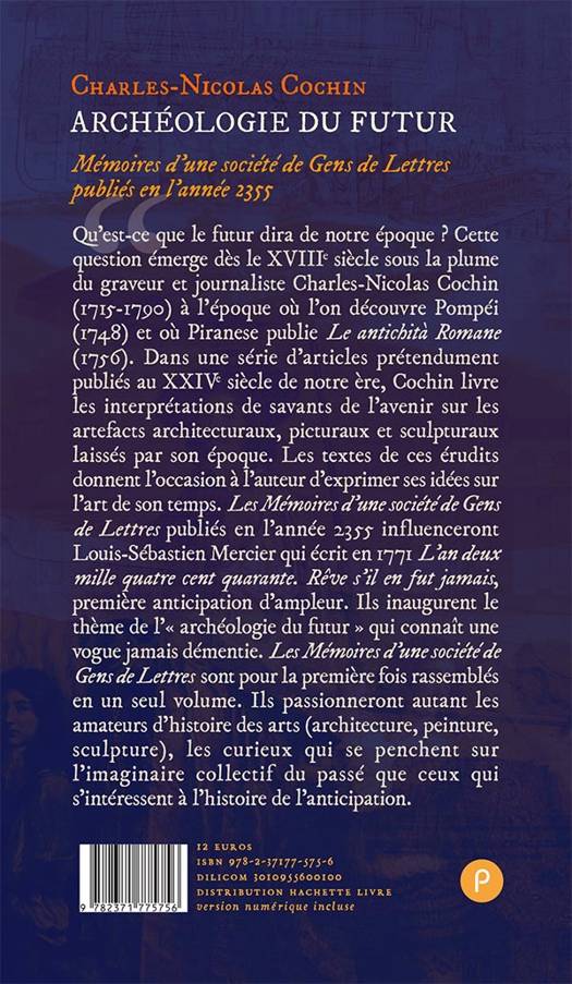 Qu'est-ce que le futur dira de notre époque ? Cette question émerge dès le XVIIIe siècle sous la plume du graveur et journaliste Charles-Nicolas Cochin (1715-1790) à l'époque où l'on découvre Pompéi (1748) et où Piranese publie Le antichità Romane (1756). Dans une série d'articles prétendument publiés au XXIVe siècle de notre ère, Cochin livre les interprétations de savants de l'avenir sur les artefacts architecturaux, picturaux et sculpturaux laissés par son époque. Les textes de ces érudits donnent l'occasion à l'auteur d'exprimer ses idées sur l'art de son temps. Les Mémoires d'une société de Gens de Lettres publiés en l'année 2355 influenceront Louis-Sébastien Mercier qui publie en 1771 L'an deux mille quatre cent quarante. Rêve s'il en fut jamais, première anticipation d'ampleur. Ils inaugurent le thème de l'« archéologie du futur » qui connaît une vogue jamais démentie. Les Mémoires d'une société de Gens de Lettres sont pour la première fois rassemblés en un seul volume. Ils passionneront autant les amateurs d'histoire des arts (architecture, peinture, sculpture), les curieux qui se penchent sur l'imaginaire collectif du passé que ceux qui s'intéressent à l'histoire de l'anticipation.
