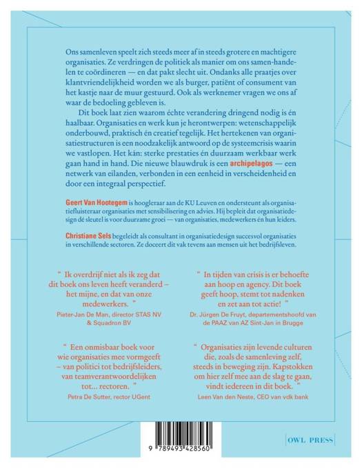 Dit boek laat zien waarom échte verandering dringend nodig is én haalbaar. Organisaties en werk kun je herontwerpen: wetenschappelijk onderbouwd, praktisch én creatief tegelijk. Het hertekenen van organisatiestructuren is een noodzakelijk antwoord op de systeemcrisis waarin we vastlopen. Het kán: sterke prestaties én duurzaam werkbaar werk gaan hand in hand. Die nieuwe blauwdruk is een archipelagos — een netwerk van eilanden, verbonden in een eenheid in verscheidenheid en door een integraal perspectief.