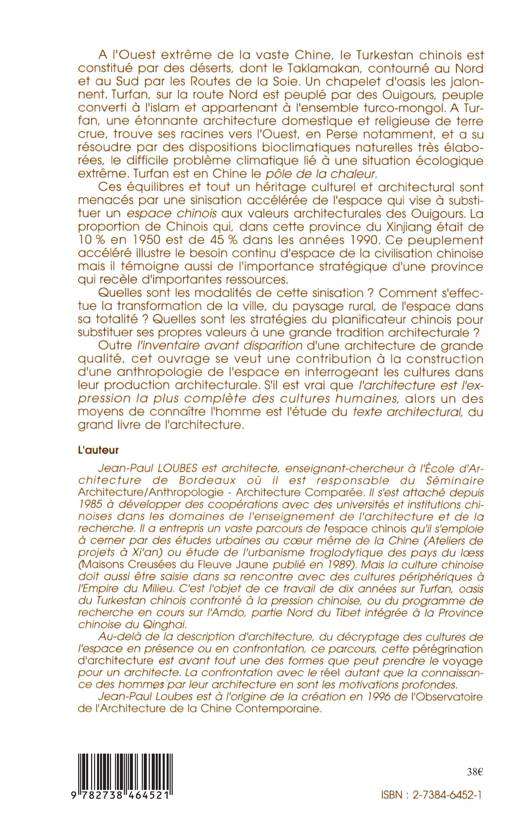 A Turfan, une étonnante architecture domestique et religieuse de terre crue, trouve ses racines vers l'Ouest, en Perse notamment, et a su résoudre par des dispositions bioclimatiques naturelles, le difficile problème climatique écologique extrême.Mais ces équilibres et tout un héritage culturel et architectural sont menacés par une sinisation accélérée de l'espace qui vise à substituer un espace chinois aux valeurs architecturales des Ouigours. Cet ouvrage se veut une contribution à la construction d'une anthropologie de l'espace en interrogeant les cultures dans leur production architecturale.