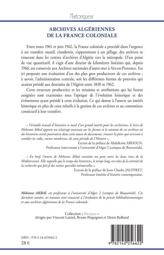 Entre mars 1961 et juin 1962, la France coloniale a procédé dans l'urgence à un transfert massif, clandestin, s'apparentant à un pillage, des archives se trouvant dans les centres d'archives d'Algérie vers la métropole. D'un point de vue quantitatif, il s'agit d'une dizaine de kilomètres linéaires qui, depuis 1966, sont conservés aux Archives nationales d'outre-mer à Aix-en-Provence. Est ici proposée une évaluation d'un des plus gros producteurs de ces archives ; à savoir, l'administration centrale, soit les différentes formes de pouvoirs qui avaient présidé aux destinées de l'Algérie entre 1830 et 1962. Cette structure productrice et les missions et attributions qui lui furent assignées sont examinées sous l'optique de l'évolution historique et des événements ayant présidé à cette évolution.