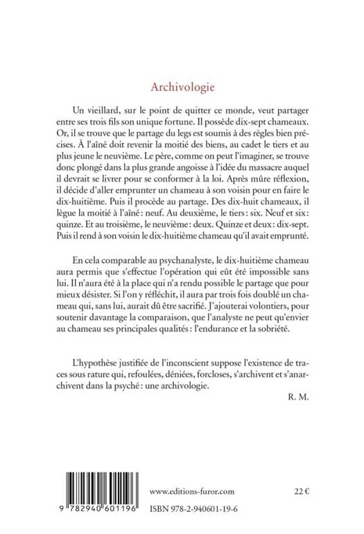 Un vieillard, sur le point de quitter ce monde, veut partager entre ses trois fils son unique fortune. Il possède dix-sept chameaux. Or, il se trouve que le partage du legs est soumis à des règles bien précises. À l’aîné doit revenir la moitié des biens, au cadet le tiers et au plus jeune le neuvième. Le père, comme on peut l’imaginer, se trouve donc plongé dans la plus grande angoisse à l’idée du massacre auquel il devrait se livrer pour se conformer à la loi. Après mûre réflexion, il décide d’aller emprunter un chameau à son voisin pour en faire le dix-huitième. Puis il procède au partage. Des dix-huit chameaux, il lègue la moitié à l’aîné : neuf. Au deuxième, le tiers : six. Neuf et six : quinze. Et au troisième, le neuvième : deux. Quinze et deux : dix-sept. Puis il rend à son voisin le dix-huitième chameau qu’il avait emprunté. En cela comparable au psychanalyste, le dix-huitième chameau aura permis que s’effectue l’opération qui eût été impossible sans lui. Il n’aura été à la place qui n’a rendu possible le partage que pour mieux désister. Si l’on y réfléchit, il aura par trois fois doublé un chameau qui, sans lui, aurait dû être sacrifié. J’ajouterai volontiers, pour soutenir davantage la comparaison, que l’analyste ne peut qu’envier au chameau ses principales qualités : l’endurance et la sobriété.