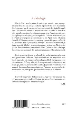 L’hypothèse justifiée de l’inconscient suppose l’existence de traces sous rature qui, refoulées, déniées, forcloses, s’archivent et s’anarchivent dans la psyché: une archivologie.