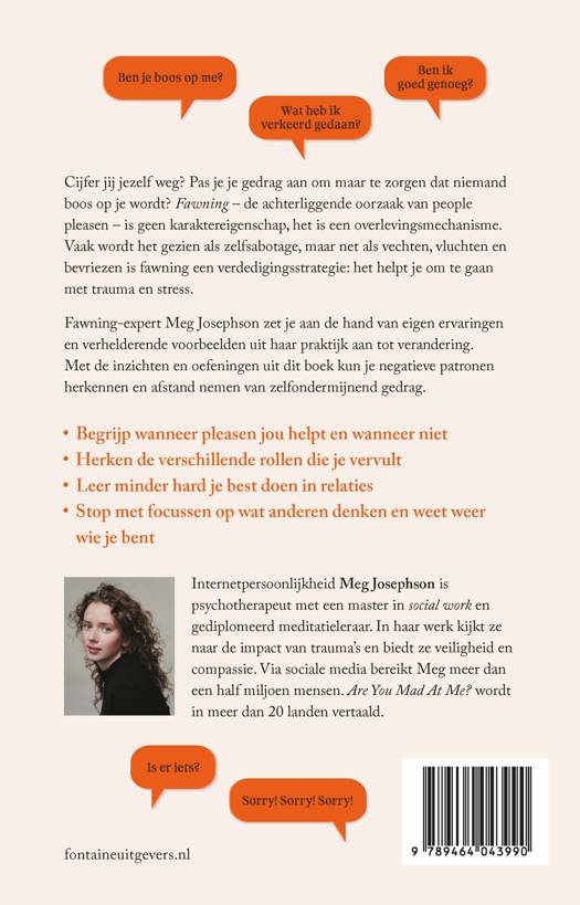 Fawning, de achterliggende oorzaak van people pleasen: waarom je jezelf aanpast en hoe je daarmee kunt stoppen Pleasen wordt vaak uitgelegd als zelfsabotage, maar is in feite een verdedigingsmechanisme. We doen het als we denken dat we iemand teleurstellen of iets verkeerd hebben gedaan. In plaats van te vechten, vluchten of bevriezen (fight, flight, freeze) is dit de vierde manier om te reageren op stress en trauma: fawning. Het betekent dat we ons aanpassen, niet zelden ten koste van onszelf. Maar wat zit er achter dit pleasegedrag? De internationaal bekende psychotherapeut en TikToksensatie Meg Josephson maakt inzichtelijk dat fawning geen slechte gewoonte is die je even af moet leren. Dit gedrag kan verklaard worden door trauma's die je dwongen om jezelf te beschermen. Met toegankelijke tools als meditatie, inzichten uit erkende therapievormen, oosterse wijsheden en mindfulness leert Meg je jezelf te helen. Voor lezers van Nicole Lepera (How to Do The Work), Bessel van der Kolk (Traumasporen) en Brene Brown (De kracht van kwetsbaarheid).