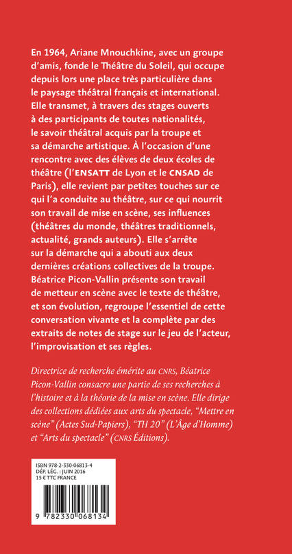 En 1964, Ariane Mnouchkine, avec un groupe d'amis, fonde le Théâtre du Soleil, qui occupe depuis lors une place très particulière dans le paysage théâtral français et international. Elle transmet, à travers des stages ouverts à des participants de toutes nationalités, le savoir théâtral acquis par la troupe et sa démarche artistique. A l'occasion d'une rencontre avec des élèves de deux écoles de théâtre (ENSATT de Lyon et CNSAD de Paris), elle revient par petites touches sur ce qui l'a conduite au théâtre, sur ce qui nourrit son travail de mise en scène, ses influences (théâtres du monde, théâtres traditionnels, actualité, grands auteurs). Elle s'arrête sur la démarche qui a abouti aux deux dernières créations collectives de la troupe. Béatrice Picon-Vallin présente son travail de metteur en scène avec le texte de théâtre, et son évolution, regroupe l'essentiel de cette conversation vivante et la complète par des extraits de notes de stage sur le jeu de l'acteur, l'improvisation et ses règles.