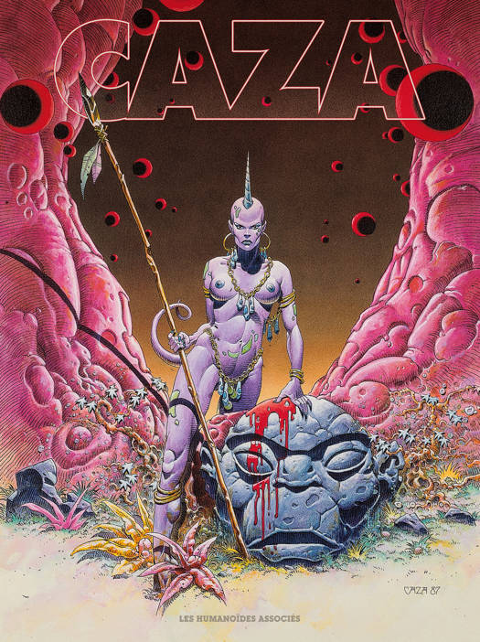 La transformation d’un humanoïde en oiseau sublime, la célébration muette du corps féminin, une réécriture du mythe de l’Arche de Noé, un univers planet-fantasy complétement décalé, une succession de triptyques aussi poétiques que magistraux… Caza a mis la précision de son trait au service de son imaginaire pour livrer une vision quasi psychédélique de la science-fiction – le tout dans une ambiance érotico-cosmique dopée par une mise en couleur saisissante.