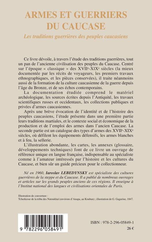 A travers l'étude des traditions guerrières, tout un pan de l'ancienne civilisation des peuples du Caucase est dévoilé. Après une brève évocation de l'identité et de l'histoire des peuples caucasiens, l'étude présente dans une première partie leurs traditions martiales, et le contexte social et économique de la production et de l'emploi des armes dans l'ancien Caucase. La seconde partie est un catalogue des types d'armes des XVIIè-XIXè siècles, avec une illustration abondante. (voir aussi : https://www.editions-harmattan.fr/livre-nouvelles_recherches_sur_les_armes_traditionnelles_du_caucase_iaroslav_lebedynsky-9782343209135-67748.html).