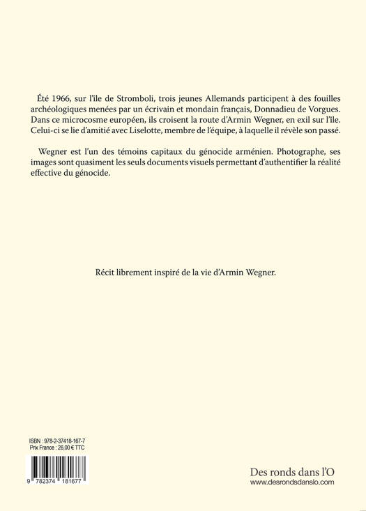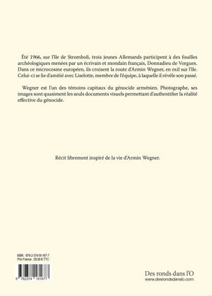 Été 1966, sur l’île de Stromboli, trois jeunes Allemands participent à des fouilles archéologiques menées par un écrivain et mondain français, Donnadieu de Vorgues. Dans ce microcosme européen, ils croisent la route d’Armin Wegner, en exil sur l’île. Celui-ci se lie d’amitié avec Liselotte, membre de l’équipe, à laquelle il révèle son passé. A.Wegner est l’un des témoins capitaux des génocides arménien. Photographe, ses images sont (quasiment) les seuls documents visuels permettant d’authentifier la réalité effective du génocide arménien.