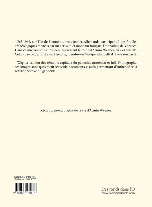 Été 1966, sur l’île de Stromboli, trois jeunes Allemands participent à des fouilles archéologiques menées par un écrivain et mondain français, Donnadieu de Vorgues. Dans ce microcosme européen, ils croisent la route d’Armin Wegner, en exil sur l’île. Celui-ci se lie d’amitié avec Liselotte, membre de l’équipe, à laquelle il révèle son passé. A.Wegner est l’un des témoins capitaux des génocides arménien et juif. Photographe, ses images sont (quasiment) les seuls documents visuels permettant d’authentifier la réalité effective du génocide arménien.